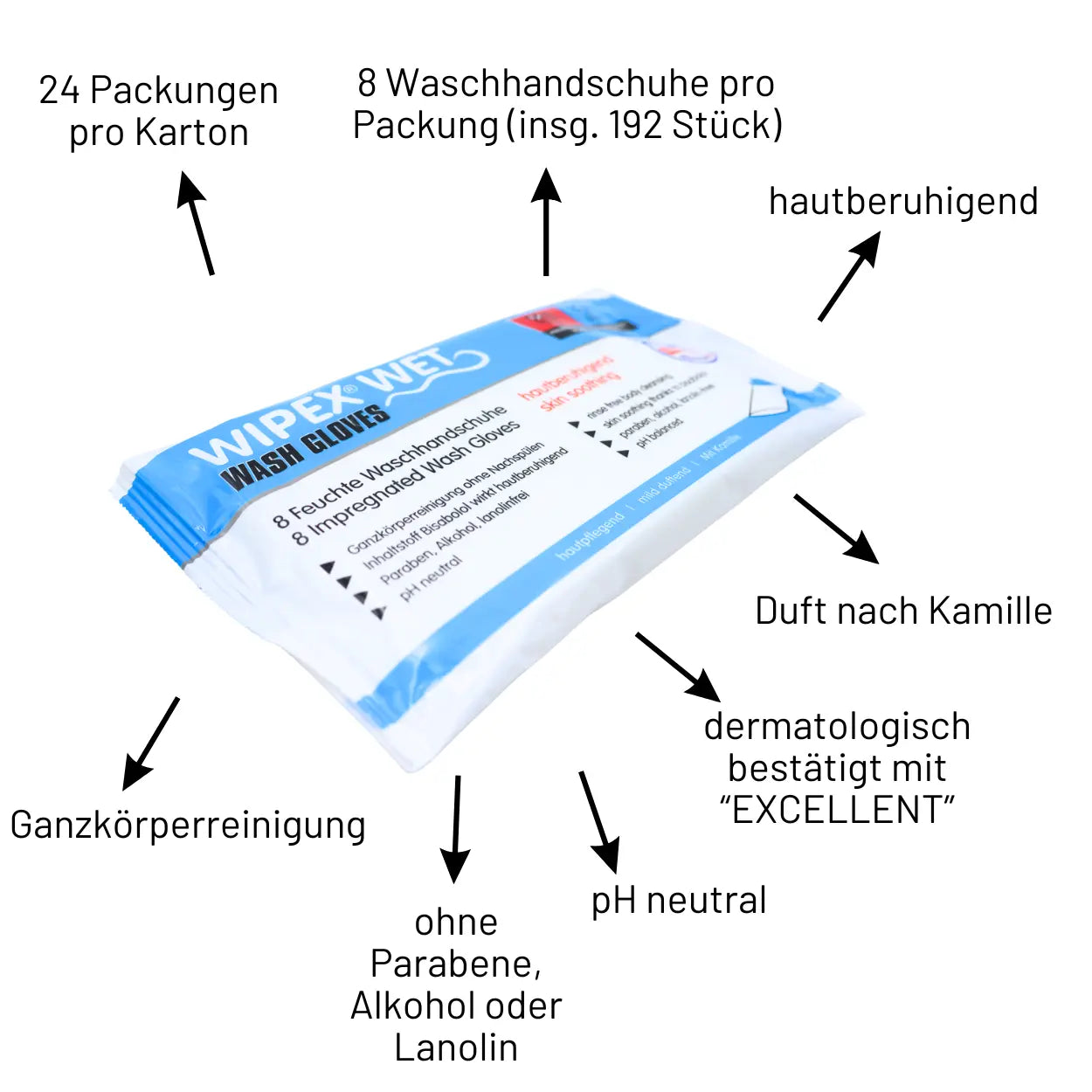 Die WIPEX Wet Wash Gloves sind ideal für Krankenhäuser, Pflegeheime, Rehaeinrichtungen, Hotels und den mobilen Pflegedienst. Sie bieten eine schnelle, hygienische und ressourcenschonende Alternative zur klassischen Körperpflege mit Wasser.